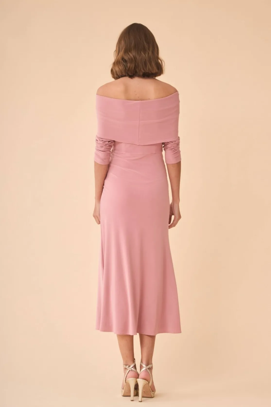 Midi party dress made of pink knit fabric. Cut at the waist and fluid skirt. Strapless neckline with long sleeves.