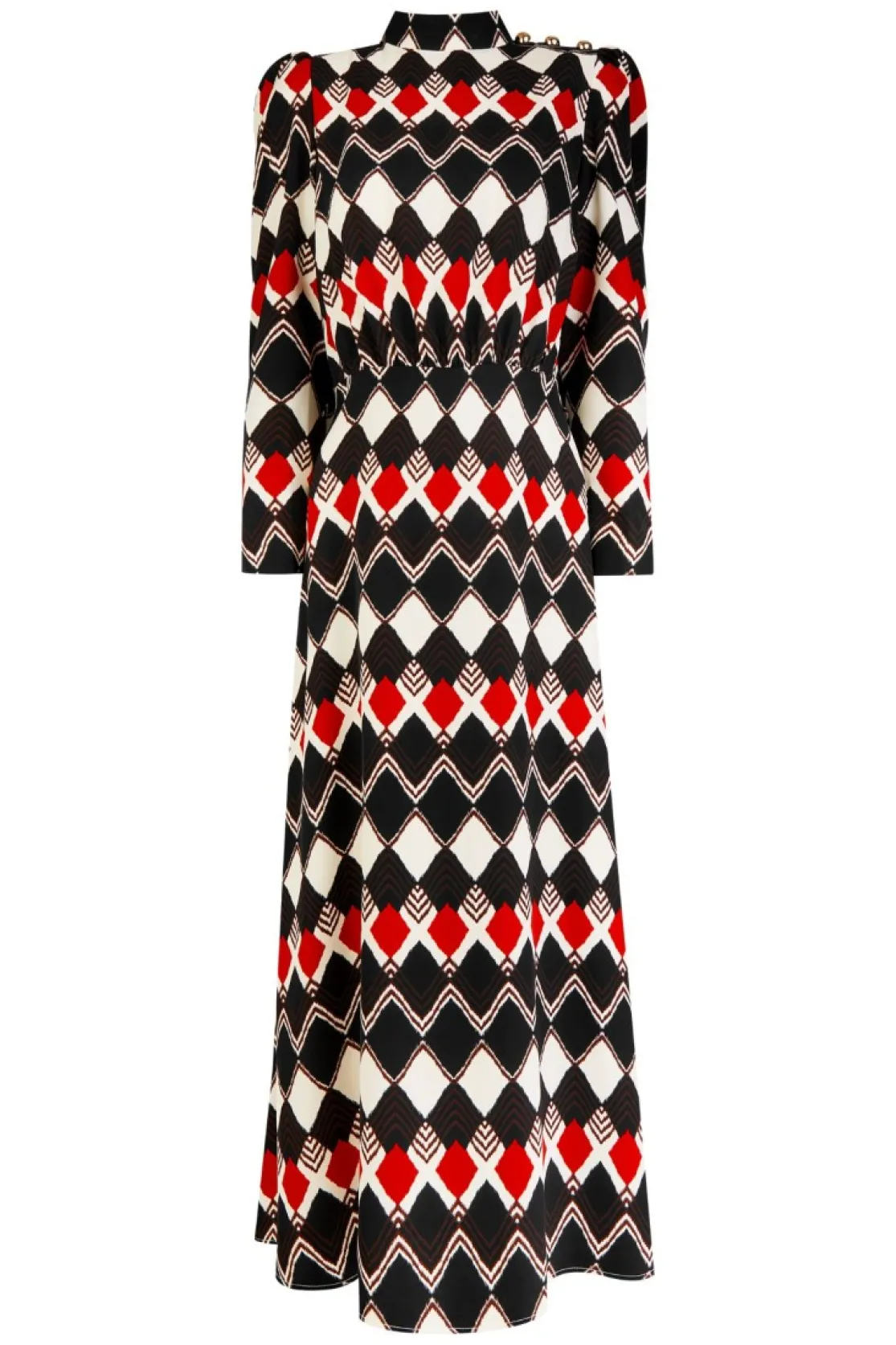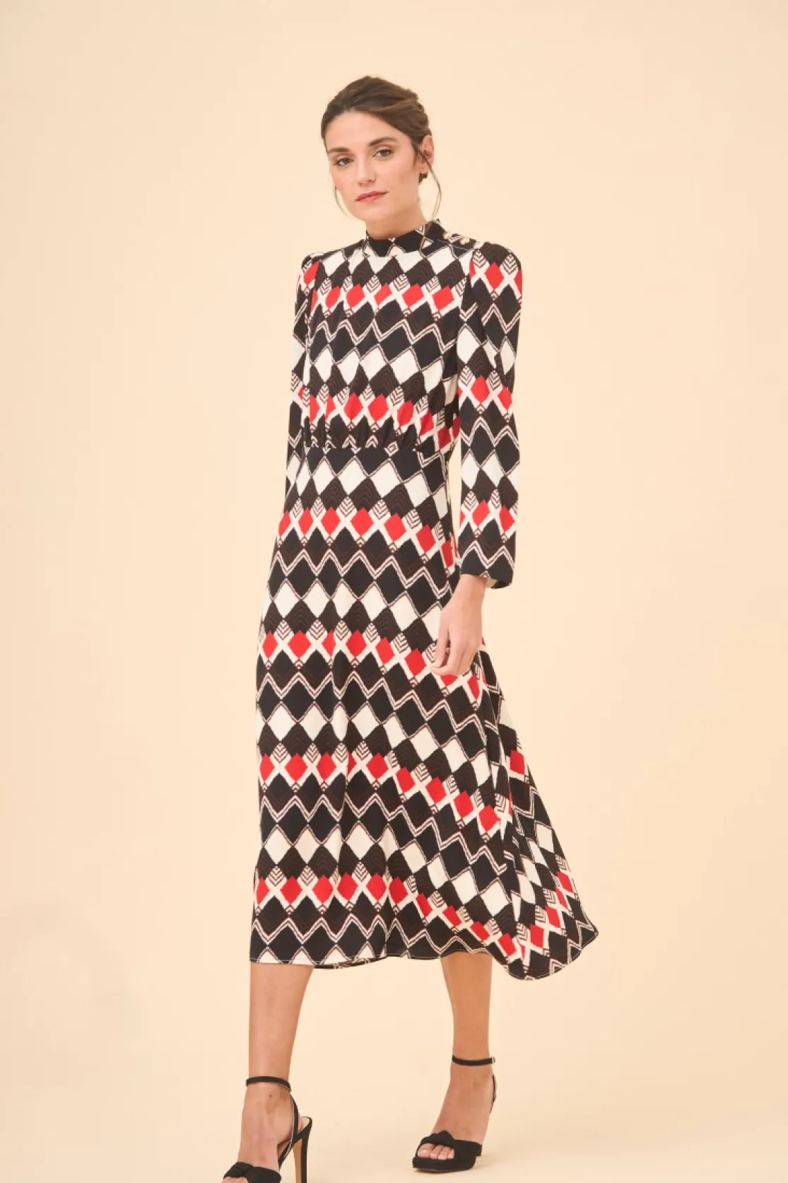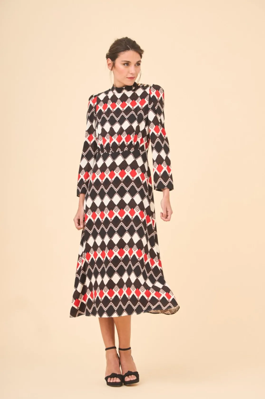Midi dress made of diamond patterned fabric. High collar and long sleeves. Detail of golden buttons on the shoulder. Gathered body and midi skirt with flounce.