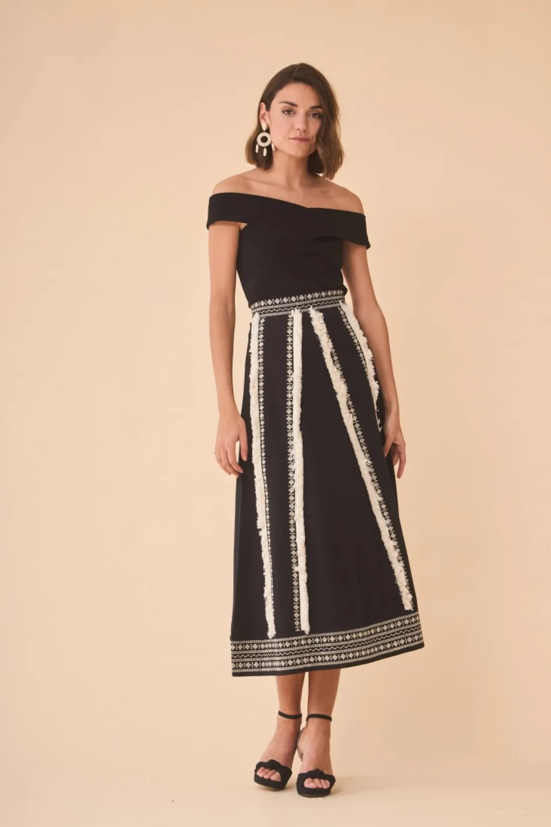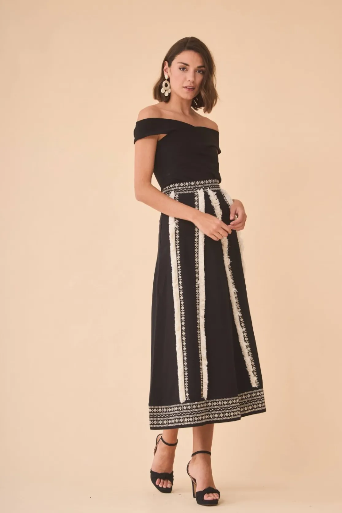 High-waisted midi skirt made of black cotton. Fringe detail on the front and beige embroidery on the hem. Invisible side zipper closure.