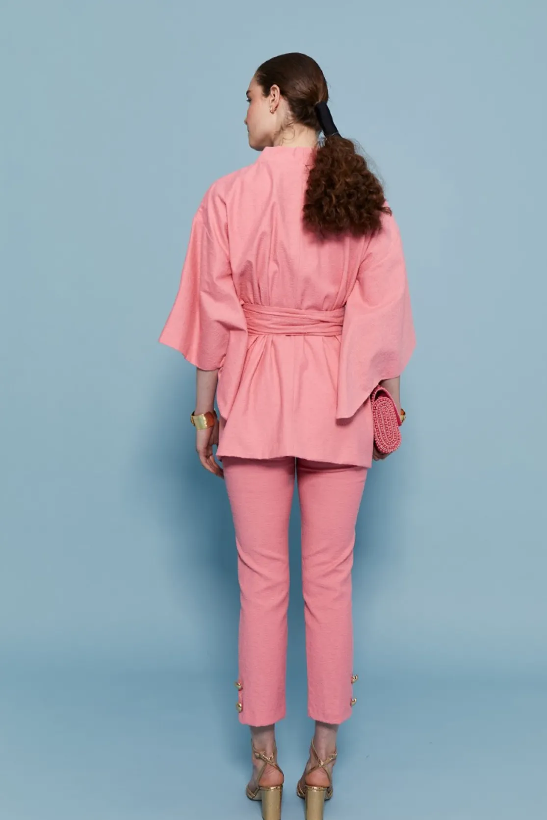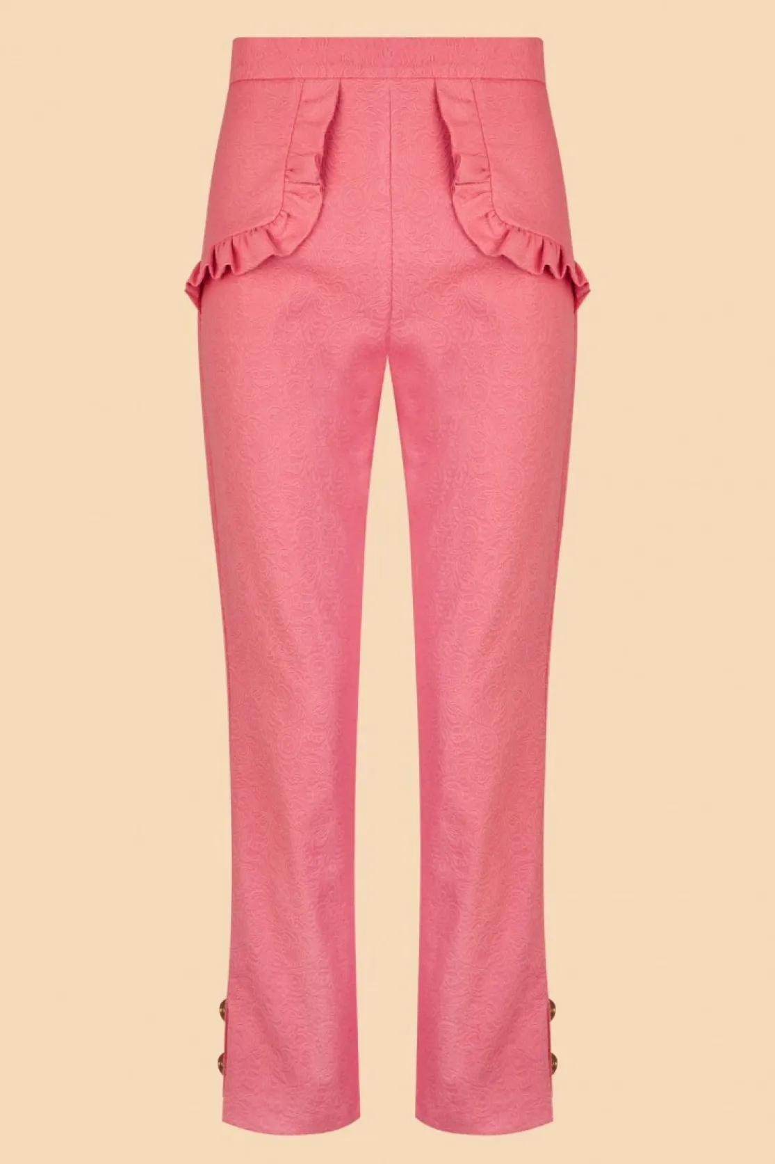 Straight cut pants made of pink brocade fabric. High waist with waistband in the same fabric and ankle length with buttons. Back invisible zipper closure.