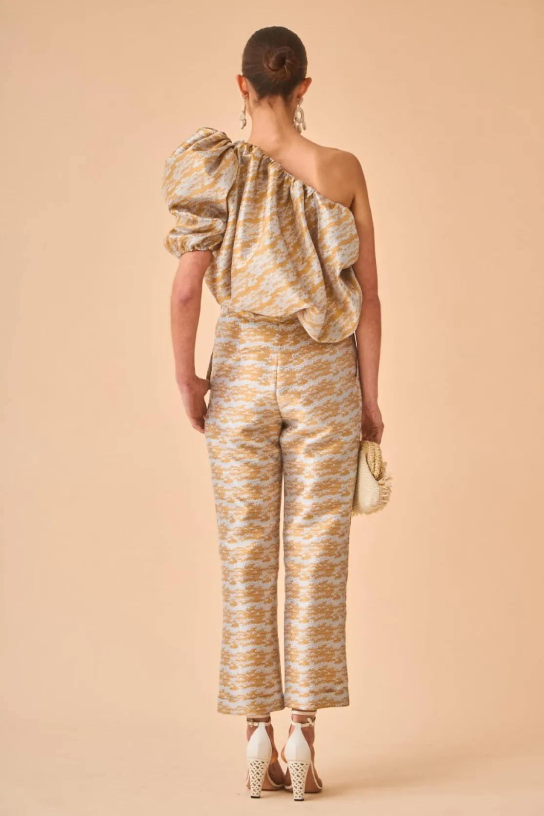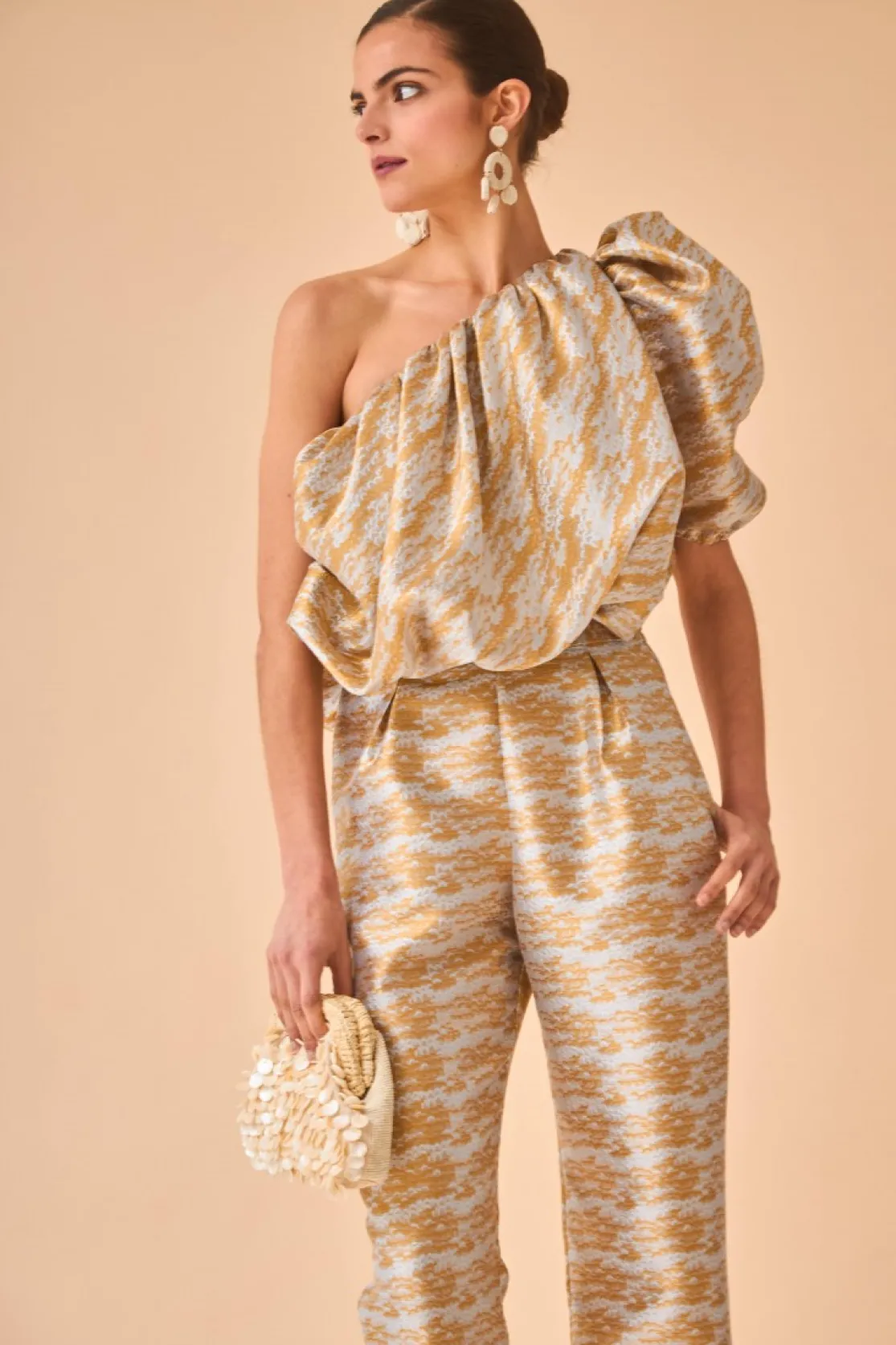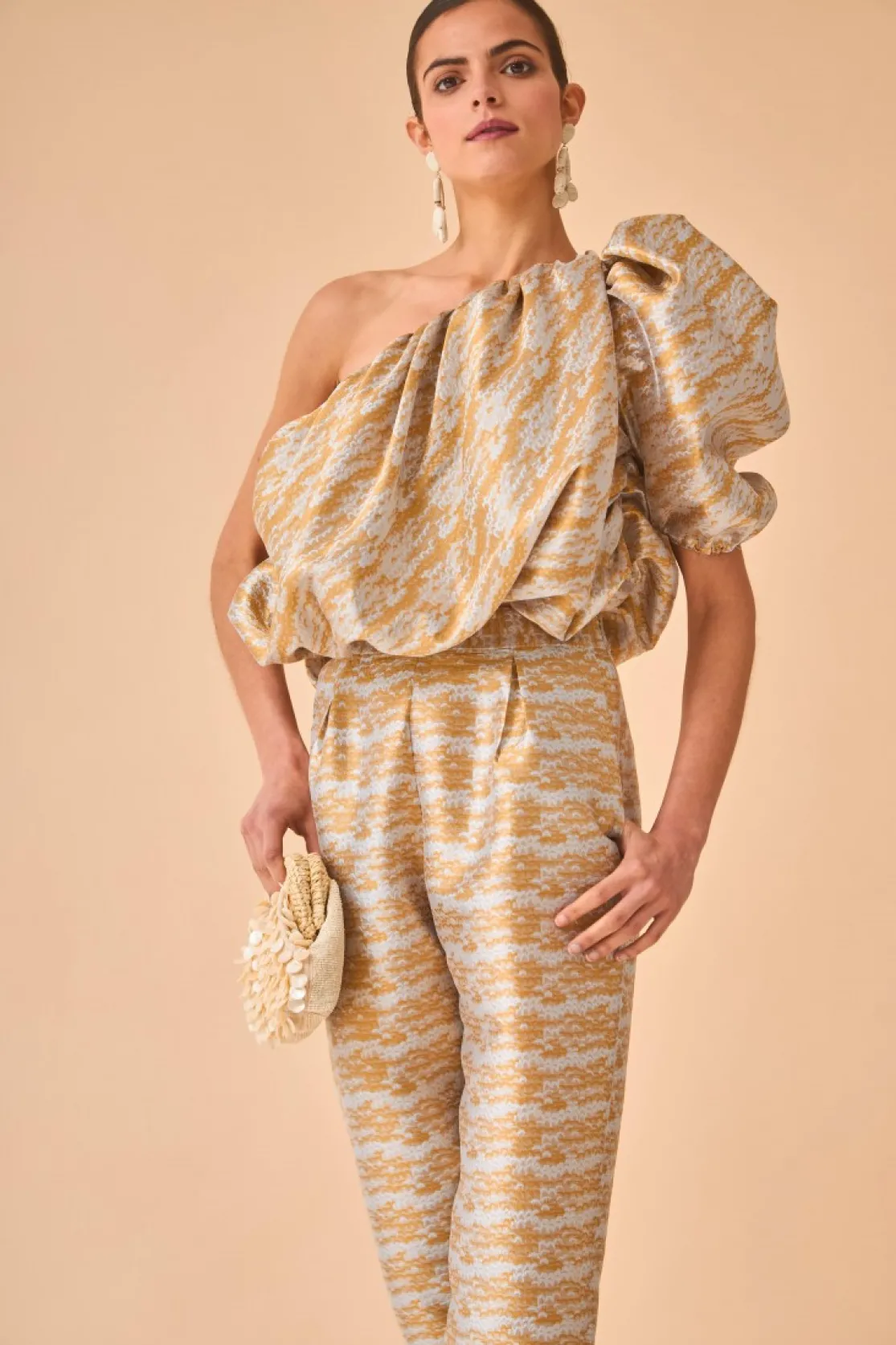 Top made of metallic fabric. Balloon effect fitted at the waist. Short asymmetrical puff sleeves.