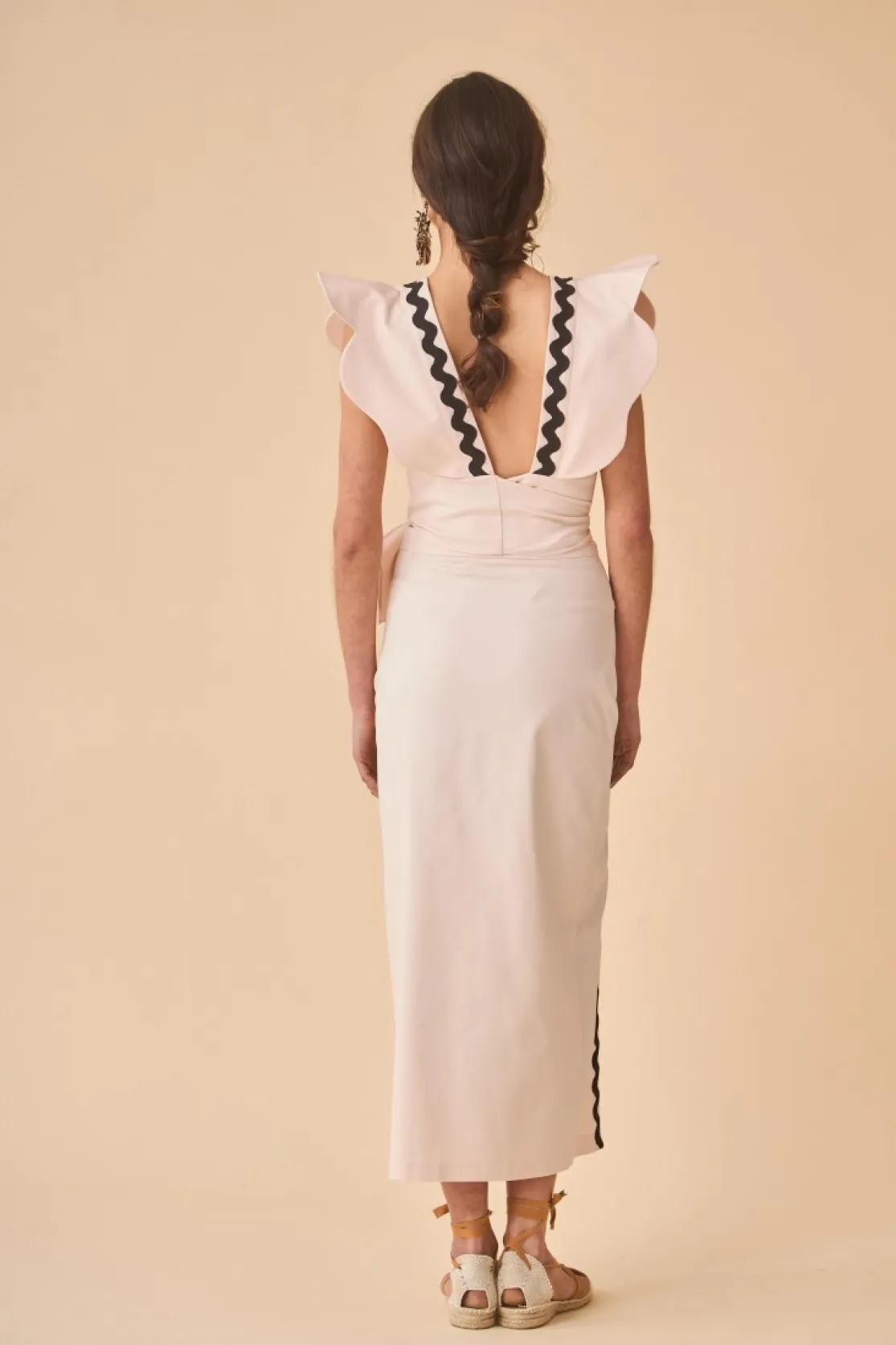 Top made of cream-colored fabric. Square neckline, sleeveless and maxi lapels as shoulder pads. Includes contrasting piconelle detail in black. V-neckline on the back and multi-position maxi bow closure.