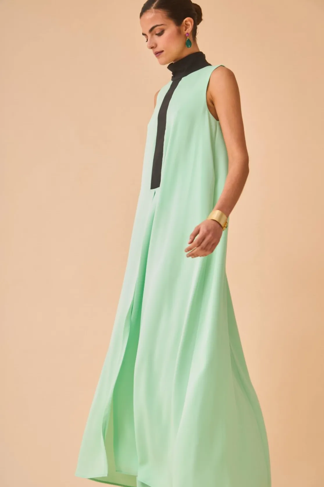 Long top made of aquamarine crepe. High neck and contrasting detail on the chest made of the same black fabric. Sleeveless, asymmetrical length and front opening. Back invisible zipper closure.