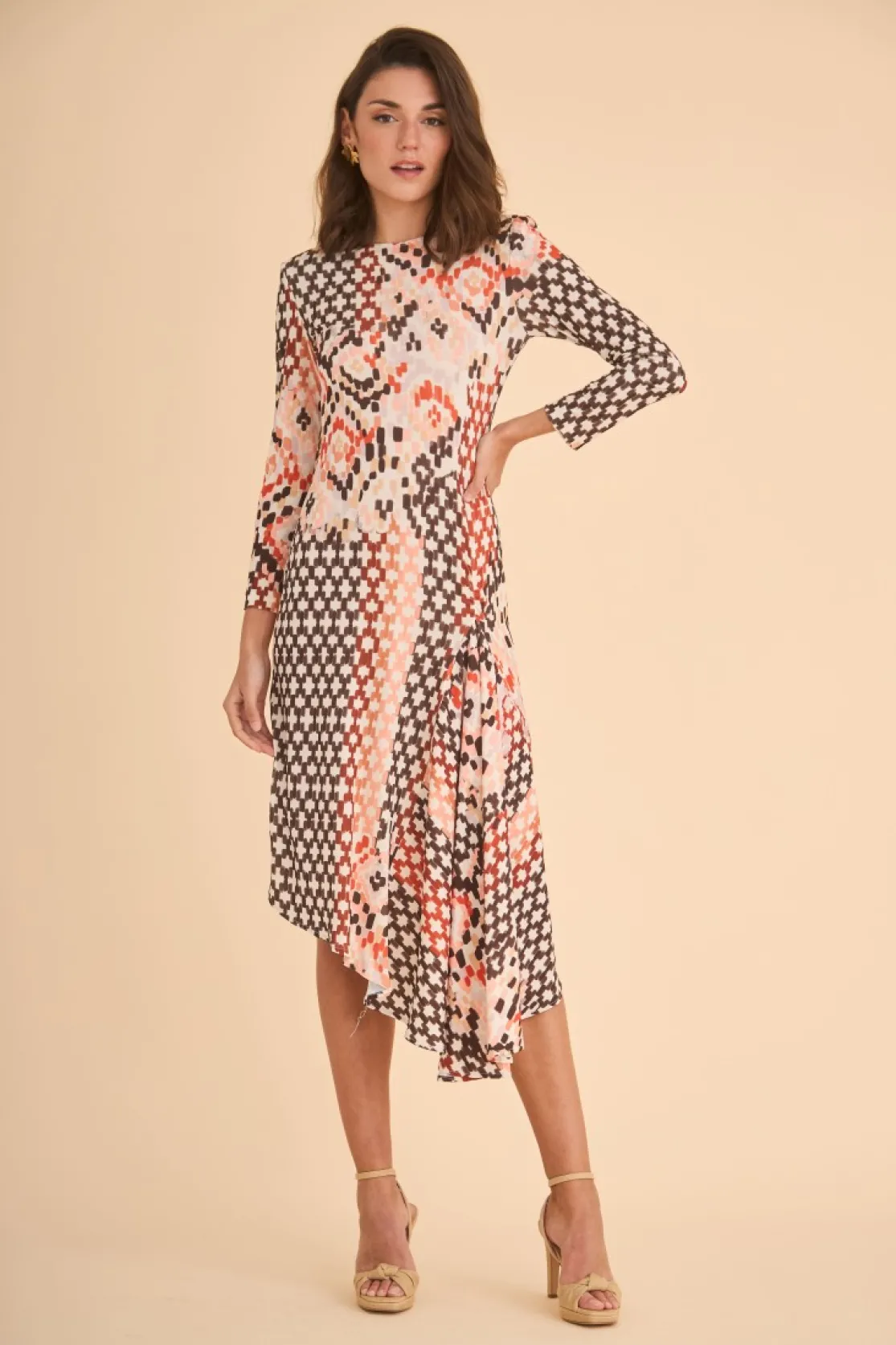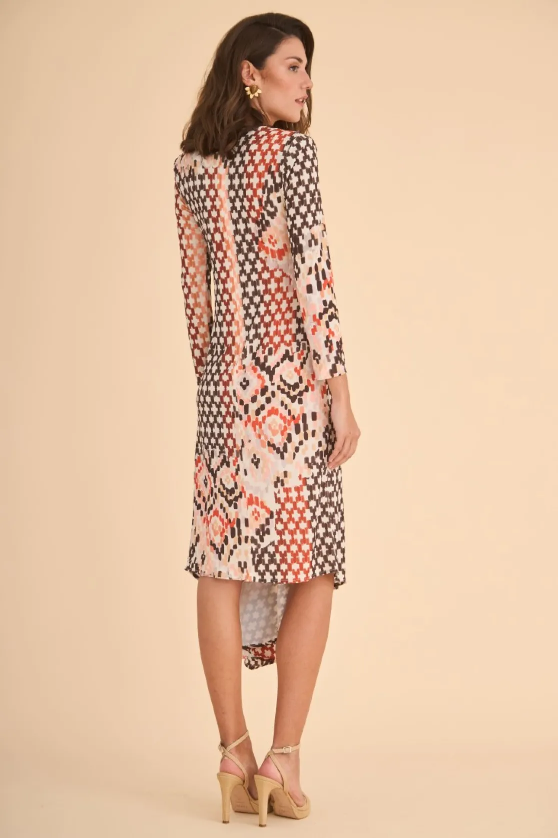Midi dress made of knitted fabric printed with ethnic motifs. Round neck and long sleeves. Cut at the waist and asymmetrical length with side draping on the skirt. Invisible back zipper closure.