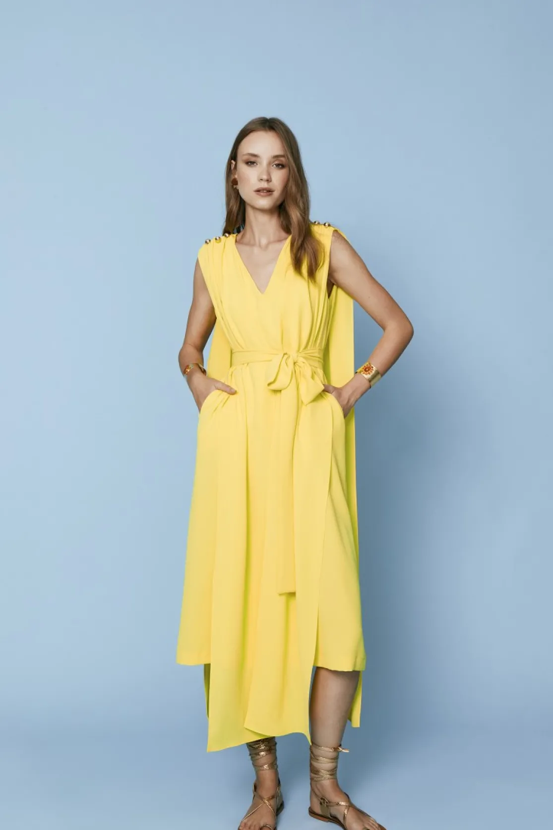 Party dress made of yellow crepe. V-neck, gold buttons on the shoulders and wide straps with a cape effect. Midi length and straight cut.