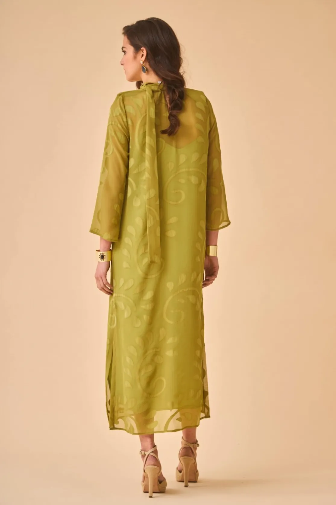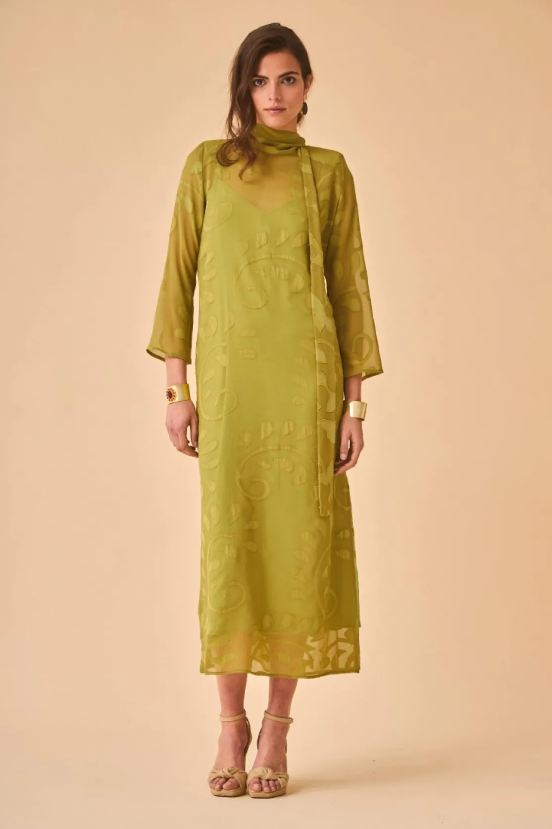 Olive two-piece party dress. Inner dress with thin straps made in olive fabric and jacket made in tone-on-tone chiffon. Perkins collar with multi-position maxi lacing. Includes shoulder pads lined in the same fabric.