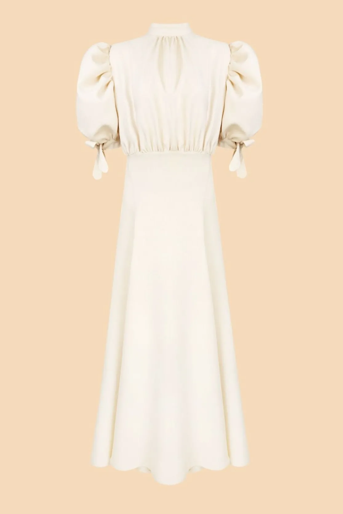 Party dress made of raw fabric. Short puff sleeves with adjustable tie. High neck and gathered body. Cut at the waist and flared midi skirt.