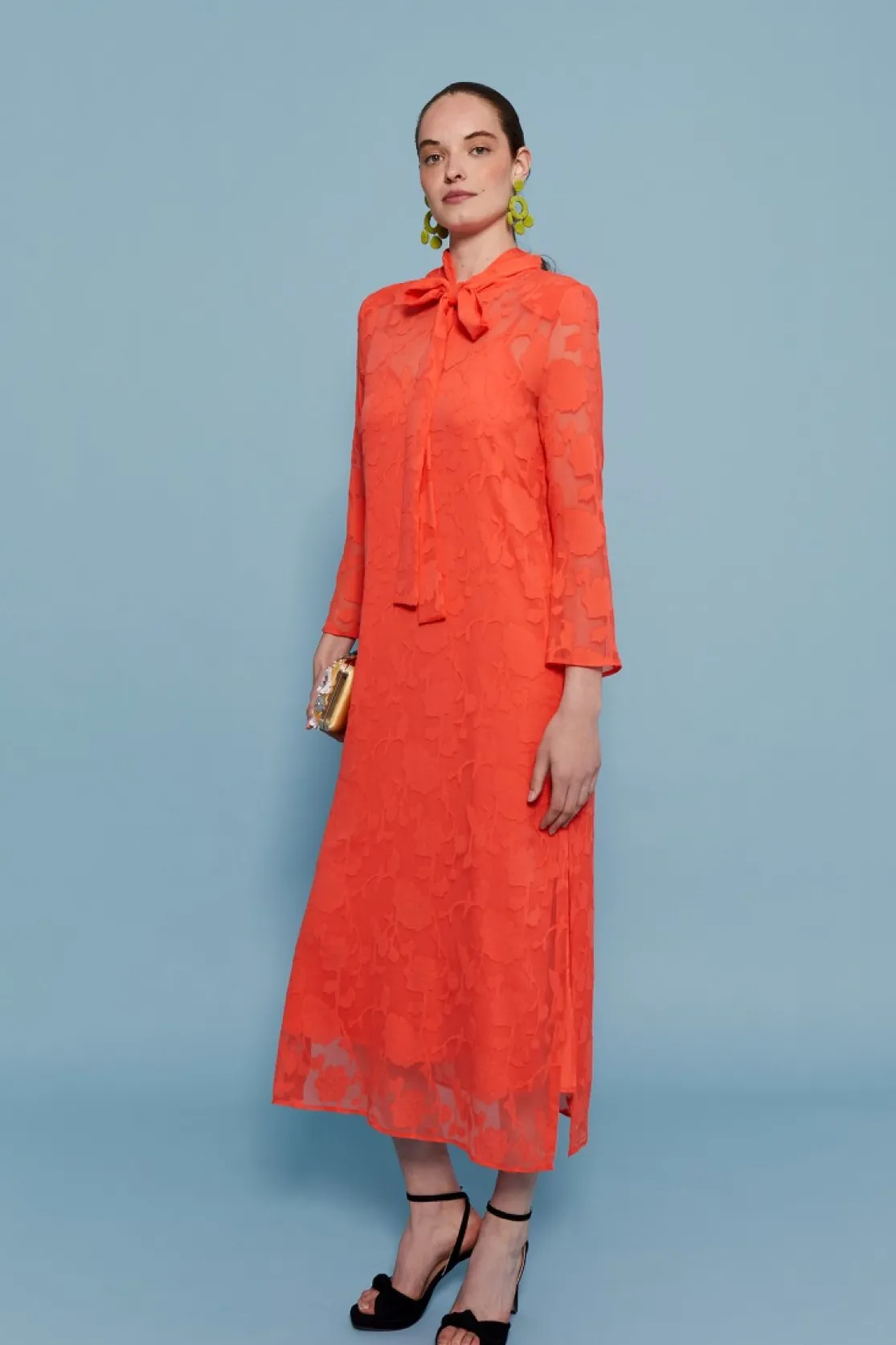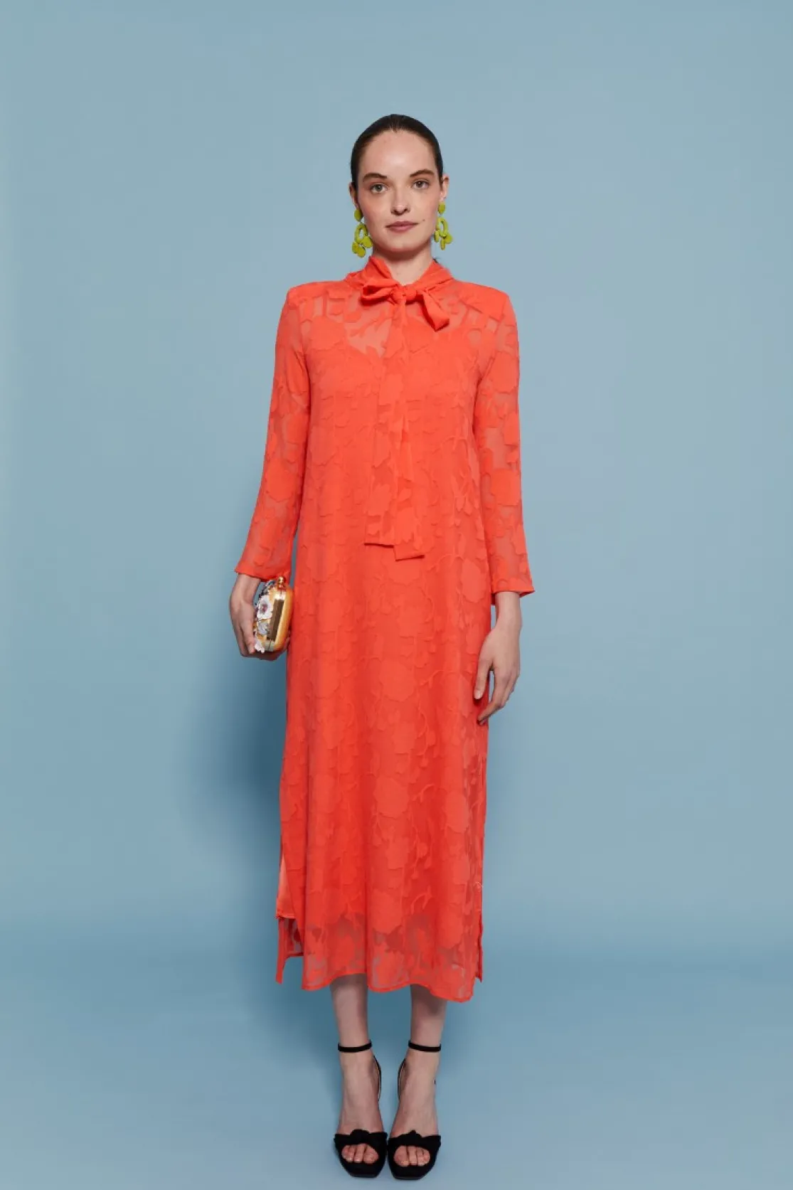 Two-piece fluorine coral colored party dress. Underdress with thin straps made of coral-colored fabric and jacket made of matching chiffon. Perkins collar with maxi multi-position lacing. Includes shoulder pads lined in the same fabric.