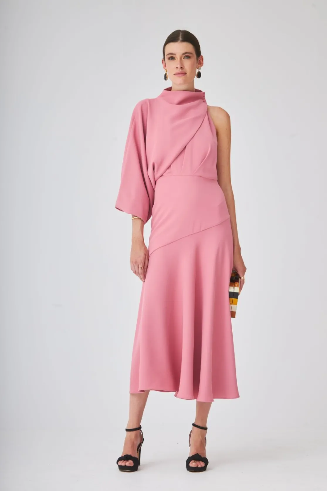 Midi dress made of pink crepe. Halter neck with detachable asymmetric sleeve detail with covered buttons, perfect for having two dresses in one. Cut at the waist and flowing asymmetrical skirt.