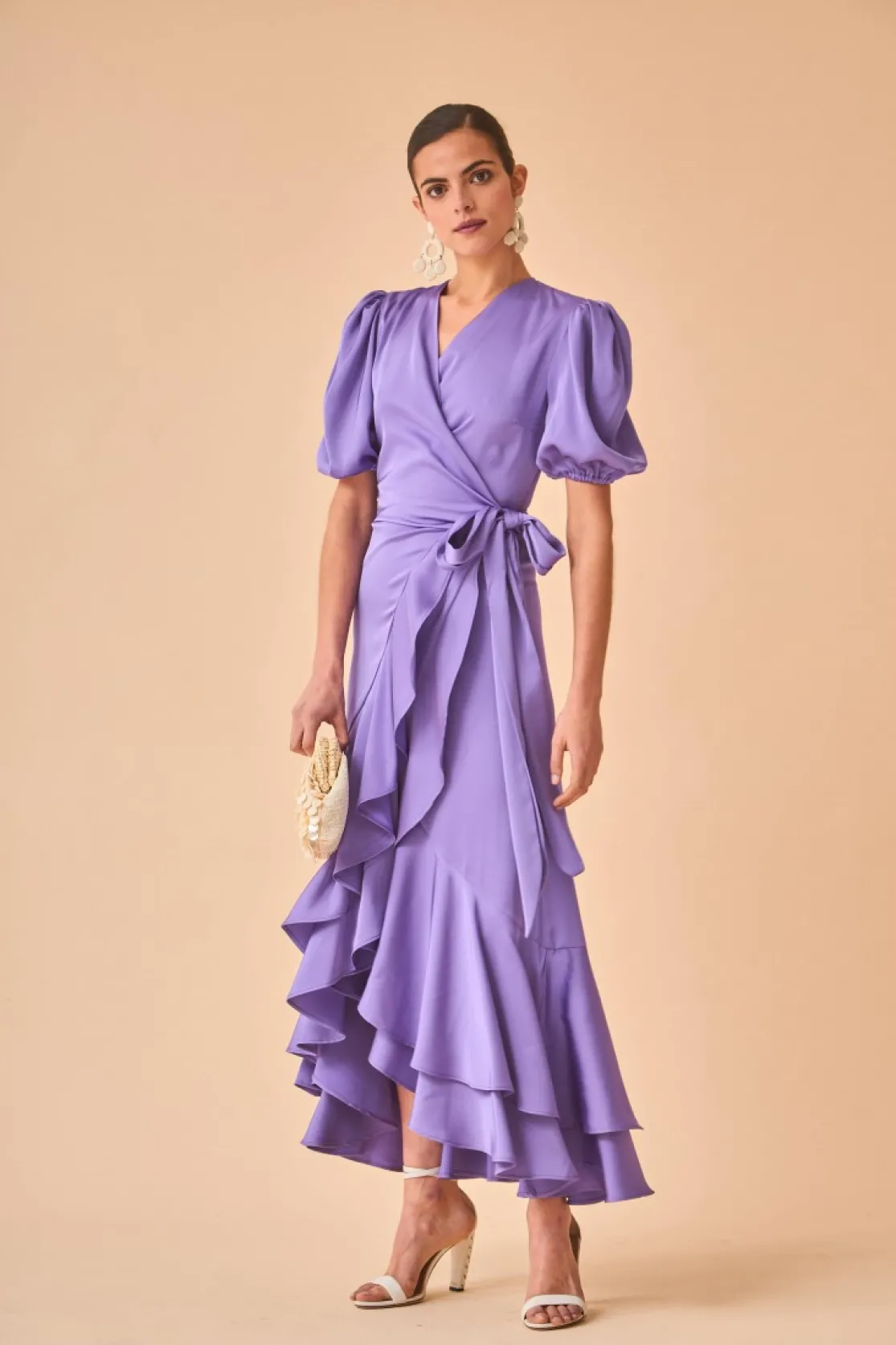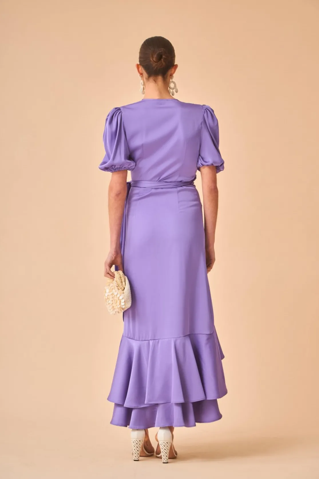 Party dress made of lilac satin. Crossed V-neckline and short puffed sleeves with elastic. Sarong style skirt with double ruffle.