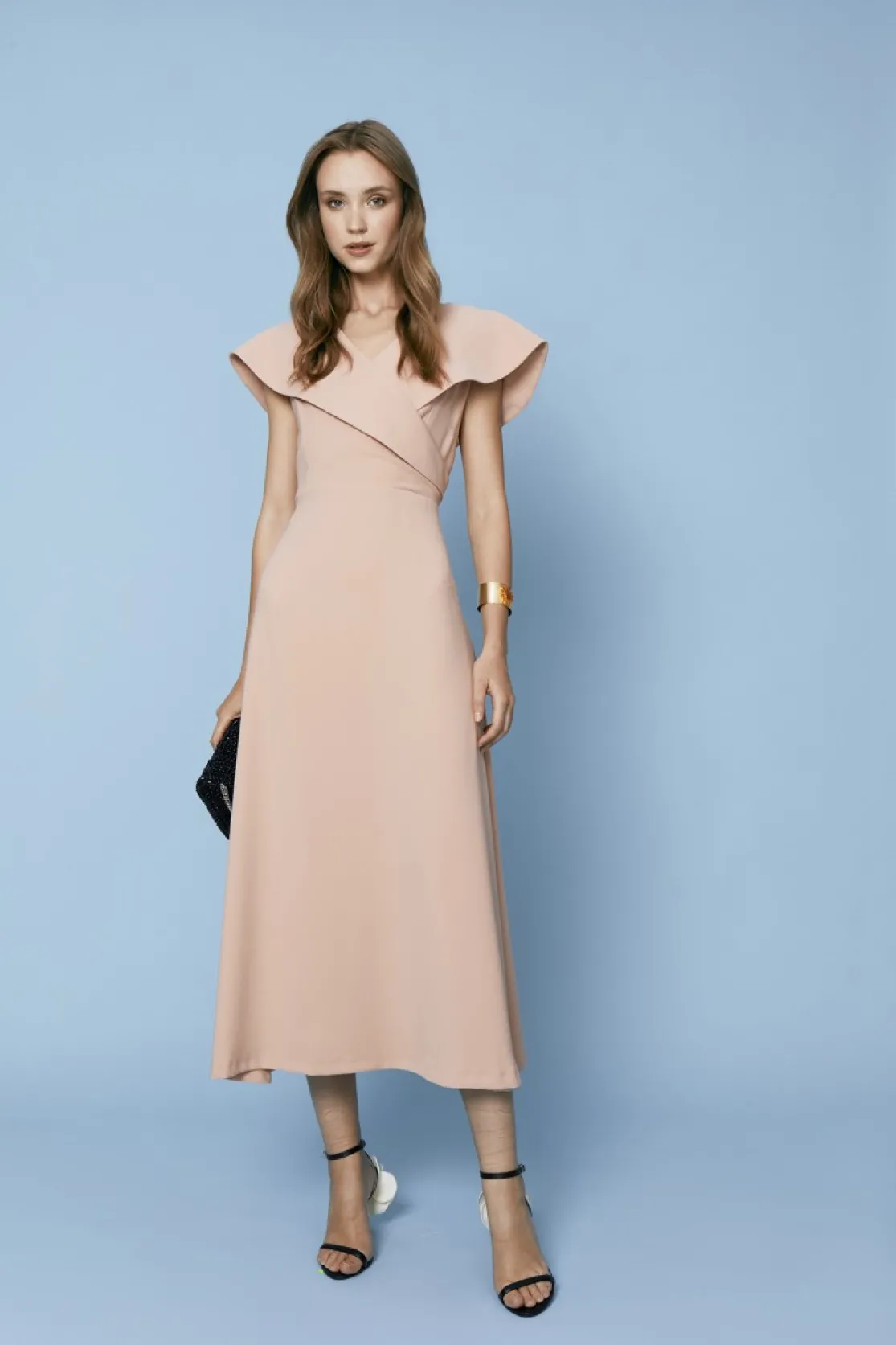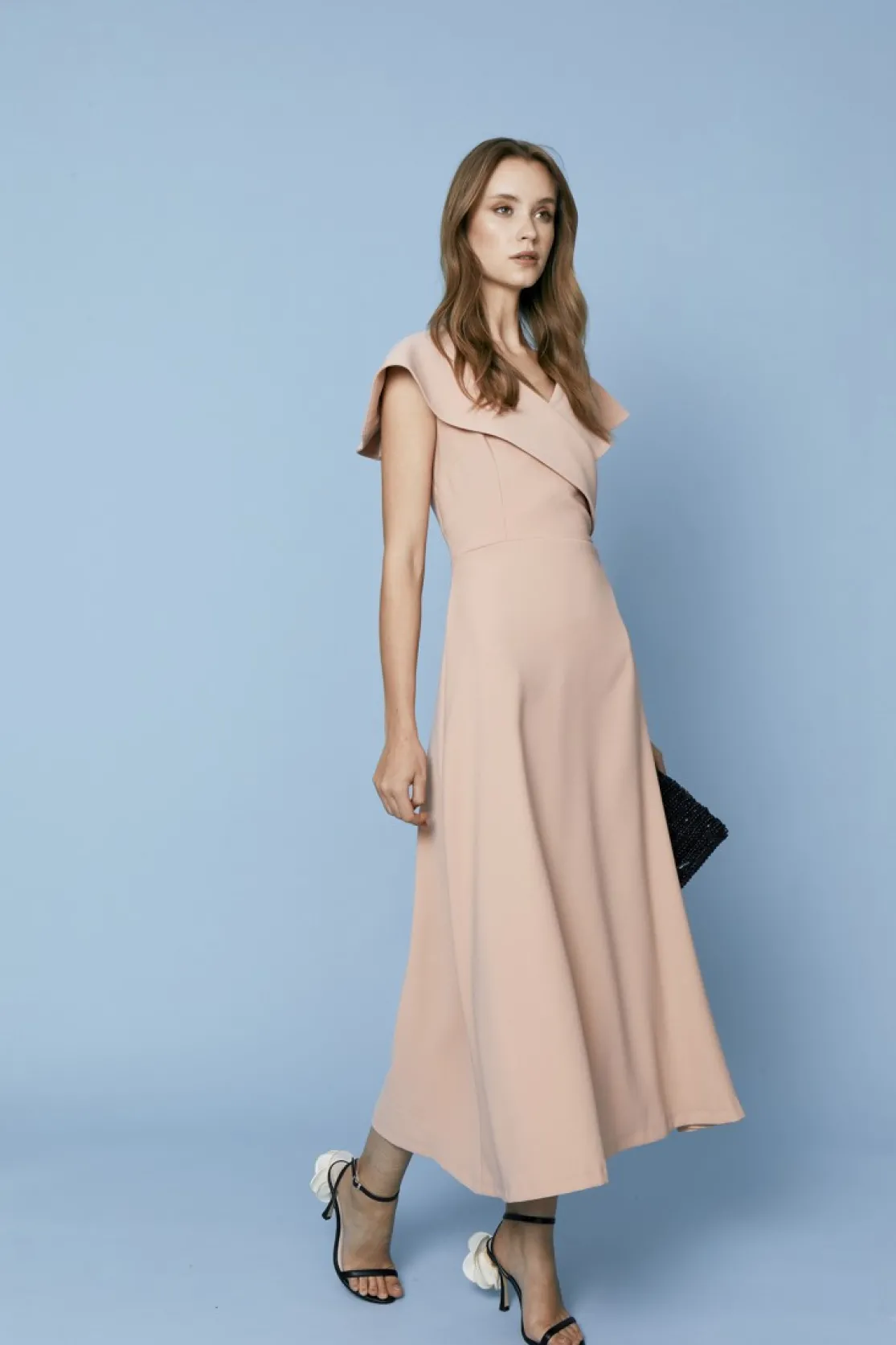 Dress made in pink crepe. Crossed V-neckline with maxi neckline, sleeveless. Cut at the waist, midi length and flowing skirt. Invisible side zipper closure.